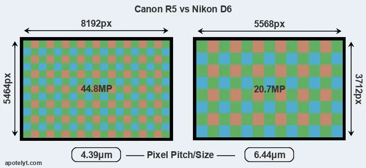 With 44.8MP, the R5 offers a higher resolution than the D6 (20.7MP), but the R5 has smaller individual pixels (pixel pitch of 4.39μm versus 6.44μm for the D6). However, the R5 is a somewhat more recent model (by 4 months) than the D6, and its sensor might have benefitted from technological advances during this time that enhance the light gathering capacity of its pixels.