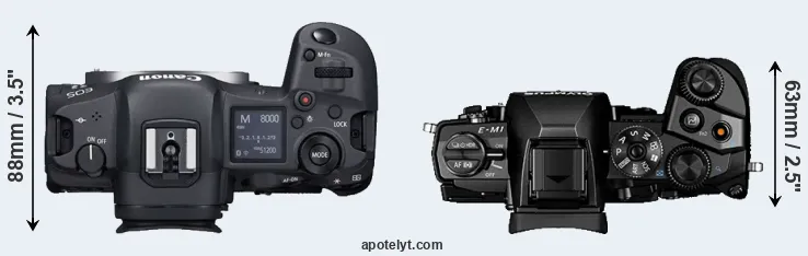 The physical size and weight of the Canon R5 and the Olympus E-M1 are illustrated in the side-by-side display below. The two cameras are presented according to their relative size. Three consecutive perspectives from the front, the top, and the back are available. All width, height and depth measures are rounded to the nearest millimeter.