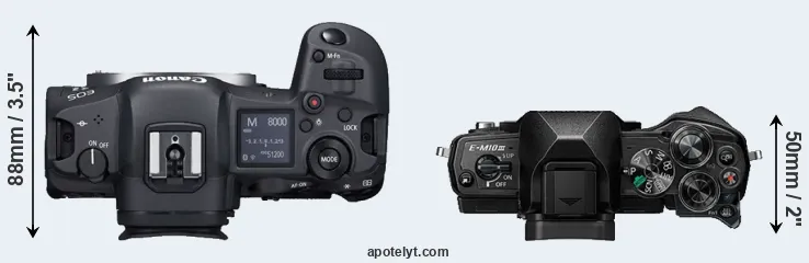 The side-by-side display below illustrates the physical size and weight of the Canon R5 and the Olympus E-M10 III. The two cameras are presented according to their relative size. Three successive views from the front, the top, and the rear are shown. All width, height and depth measures are rounded to the nearest millimeter.