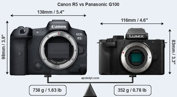 If the front view area (width x height) of the cameras is taken as an aggregate measure of their size, the Panasonic G100 is notably smaller (29 percent) than the Canon R5. Moreover, the G100 is substantially lighter (52 percent) than the R5. It is worth mentioning in this context that the R5 is splash and dust resistant, while the G100 does not feature any corresponding weather-sealing.