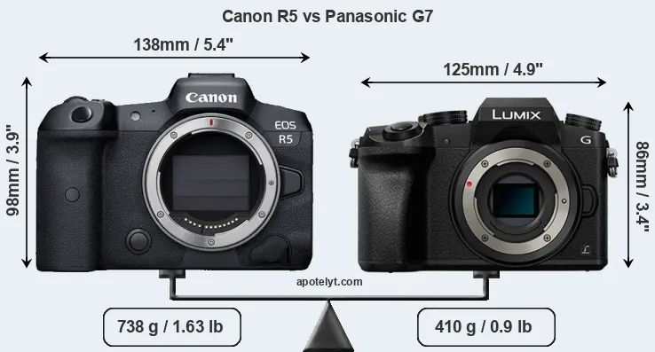 If the front view area (width x height) of the cameras is taken as an aggregate measure of their size, the Panasonic G7 is notably smaller (21 percent) than the Canon R5. Moreover, the G7 is substantially lighter (44 percent) than the R5. It is worth mentioning in this context that the R5 is splash and dust resistant, while the G7 does not feature any corresponding weather-sealing.