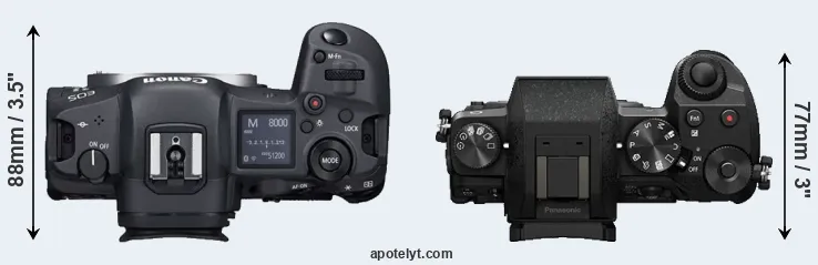 The side-by-side display below illustrates the physical size and weight of the Canon R5 and the Panasonic G7. The two cameras are presented according to their relative size. Three successive views from the front, the top, and the rear are shown. All width, height and depth dimensions are rounded to the nearest millimeter.