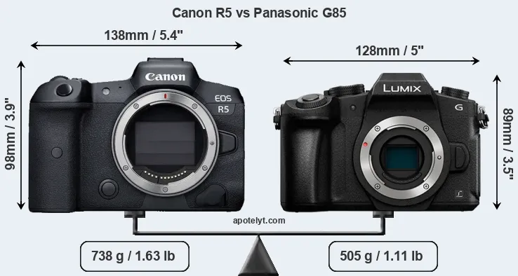 The side-by-side display below illustrates the physical size and weight of the Canon R5 and the Panasonic G85. The two cameras are presented according to their relative size. Three consecutive perspectives from the front, the top, and the back are available. All width, height and depth dimensions are rounded to the nearest millimeter.