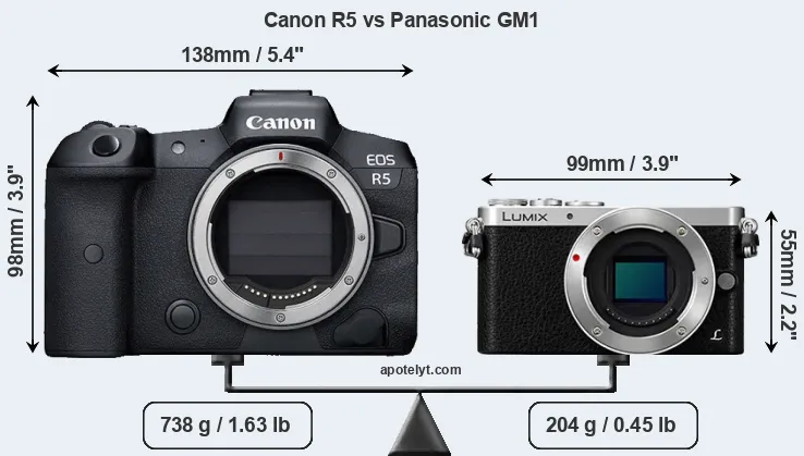 The side-by-side display below illustrates the physical size and weight of the Canon R5 and the Panasonic GM1. The two cameras are presented according to their relative size. Three successive views from the front, the top, and the rear are shown. All width, height and depth measures are rounded to the nearest millimeter.