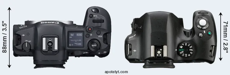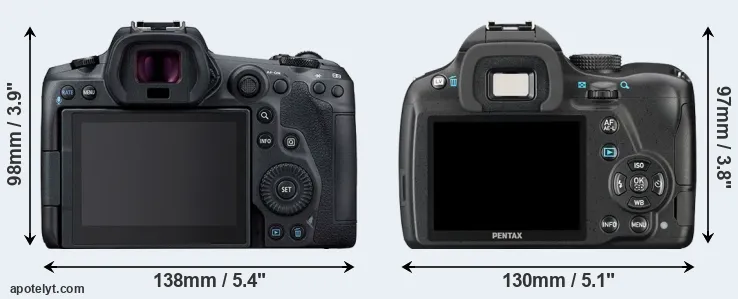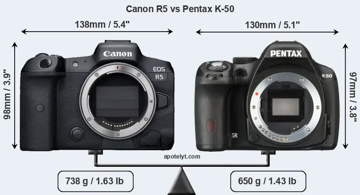 The physical size and weight of the Canon R5 and the Pentax K-50 are illustrated in the side-by-side display below. The two cameras are presented according to their relative size. Three successive views from the front, the top, and the rear are shown. All size dimensions are rounded to the nearest millimeter.