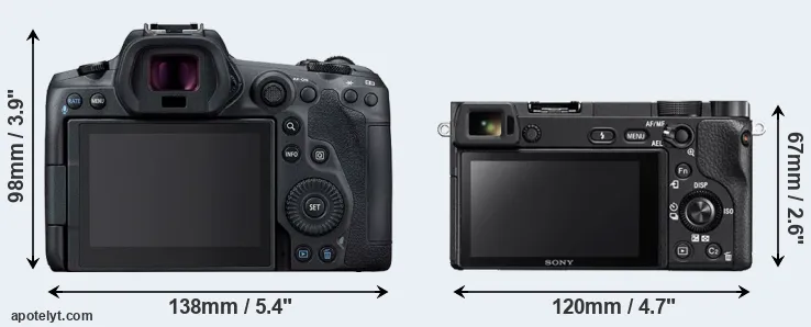 The side-by-side display below illustrates the physical size and weight of the Canon R5 and the Sony A6300. The two cameras are presented according to their relative size. Three consecutive perspectives from the front, the top, and the back are available. All width, height and depth dimensions are rounded to the nearest millimeter.