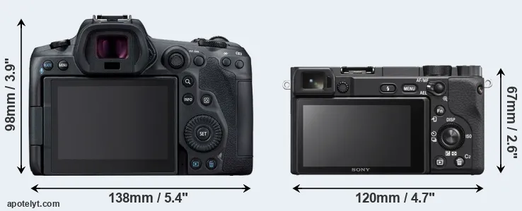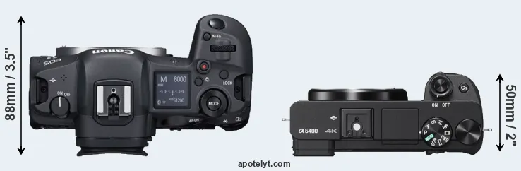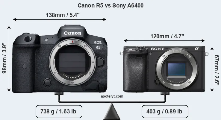 The side-by-side display below illustrates the physical size and weight of the Canon R5 and the Sony A6400. The two cameras are presented according to their relative size. Three consecutive perspectives from the front, the top, and the back are available. All width, height and depth dimensions are rounded to the nearest millimeter.