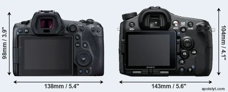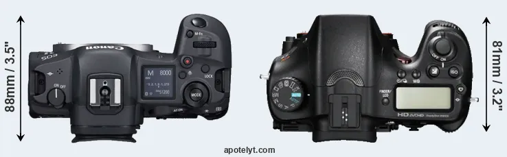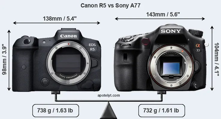 An illustration of the physical size and weight of the Canon R5 and the Sony A77 is provided in the side-by-side display below. The two cameras are presented according to their relative size. Three successive views from the front, the top, and the rear are shown. All width, height and depth dimensions are rounded to the nearest millimeter.