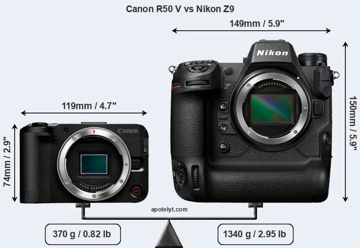 The physical size and weight of the Canon R50 V and the Nikon Z9 are illustrated in the side-by-side display below. The two cameras are presented according to their relative size. Three consecutive views from the front, the top, and the rear side are shown. All width, height and depth measures are rounded to the nearest millimeter.