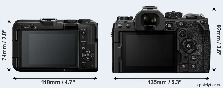 An illustration of the physical size and weight of the Canon R50 V and the OM System OM-1 is provided in the side-by-side display below. The two cameras are presented according to their relative size. Three consecutive perspectives from the front, the top, and the back are available. All size dimensions are rounded to the nearest millimeter.
