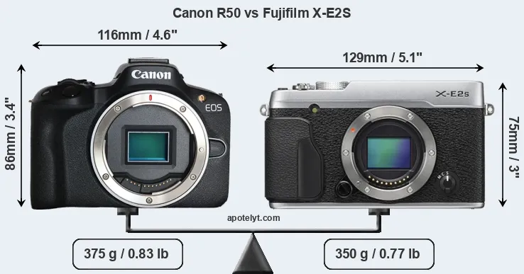 The side-by-side display below illustrates the physical size and weight of the Canon R50 and the Fujifilm X-E2S. The two cameras are presented according to their relative size. Three consecutive views from the front, the top, and the rear side are shown. All width, height and depth dimensions are rounded to the nearest millimeter.