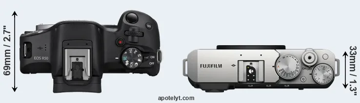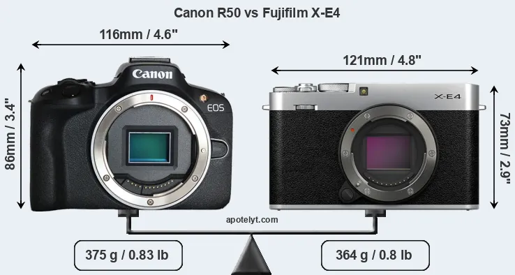 The side-by-side display below illustrates the physical size and weight of the Canon R50 and the Fujifilm X-E4. The two cameras are presented according to their relative size. Three successive views from the front, the top, and the rear are shown. All width, height and depth measures are rounded to the nearest millimeter.