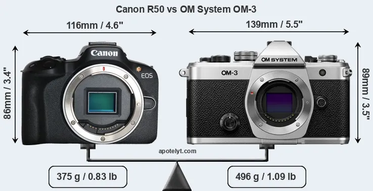 If the front view area (width x height) of the cameras is taken as an aggregate measure of their size, the OM System OM-3 is notably larger (24 percent) than the Canon R50. Moreover, the OM-3 is markedly heavier (32 percent) than the R50. It is noteworthy in this context that the OM-3 is splash and dust-proof, while the R50 does not feature any corresponding weather-sealing.