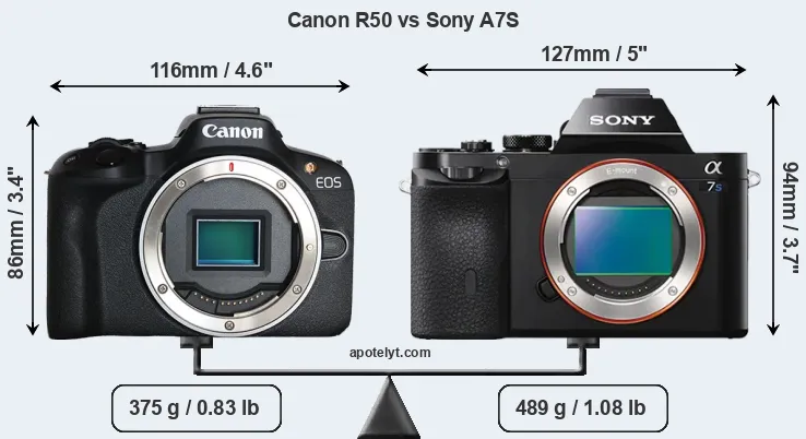 If the front view area (width x height) of the cameras is taken as an aggregate measure of their size, the Sony A7S is notably larger (20 percent) than the Canon R50. Moreover, the A7S is markedly heavier (30 percent) than the R50. It is noteworthy in this context that the A7S is splash and dust-proof, while the R50 does not feature any corresponding weather-sealing.