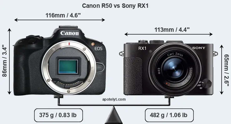 An illustration of the physical size and weight of the Canon R50 and the Sony RX1 is provided in the side-by-side display below. The two cameras are presented according to their relative size. Three successive views from the front, the top, and the rear are shown. All width, height and depth dimensions are rounded to the nearest millimeter.