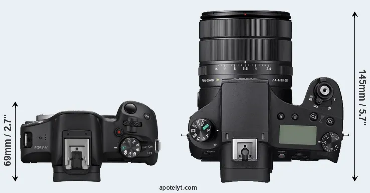 An illustration of the physical size and weight of the Canon R50 and the Sony RX10 IV is provided in the side-by-side display below. The two cameras are presented according to their relative size. Three consecutive perspectives from the front, the top, and the back are available. All width, height and depth dimensions are rounded to the nearest millimeter.
