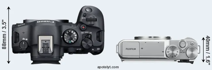 The side-by-side display below illustrates the physical size and weight of the Canon R6 Mark II and the Fujifilm X-A10. The two cameras are presented according to their relative size. Three consecutive perspectives from the front, the top, and the back are available. All width, height and depth measures are rounded to the nearest millimeter.