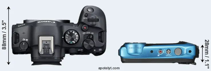 The side-by-side display below illustrates the physical size and weight of the Canon R6 Mark II and the Fujifilm XP130. The two cameras are presented according to their relative size. Three consecutive perspectives from the front, the top, and the back are available. All width, height and depth measures are rounded to the nearest millimeter.