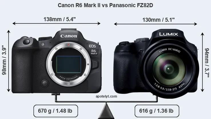 The physical size and weight of the Canon R6 Mark II and the Panasonic FZ82D are illustrated in the side-by-side display below. The two cameras are presented according to their relative size. Three consecutive perspectives from the front, the top, and the back are available. All width, height and depth dimensions are rounded to the nearest millimeter.