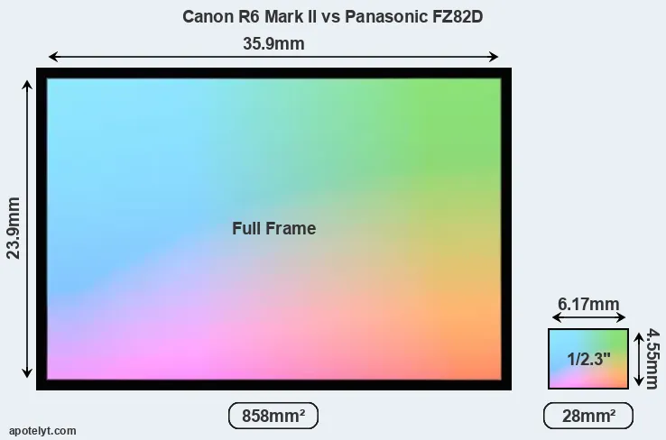 Of the two cameras under consideration, the Canon R6 Mark II features a full frame sensor and the Panasonic FZ82D a 1/2.3-inch sensor. The sensor area in the FZ82D is 97 percent smaller. As a result of these sensor size differences, the cameras have a format factor of, respectively, 1.0 and 5.6. The sensor in the R6 Mark II has a native 3:2 aspect ratio, while the one in the FZ82D offers a 4:3 aspect.