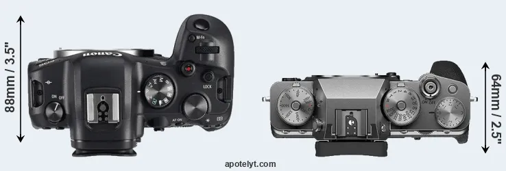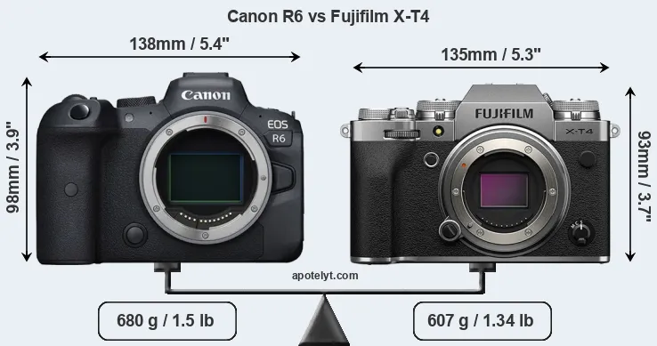 An illustration of the physical size and weight of the Canon R6 and the Fujifilm X-T4 is provided in the side-by-side display below. The two cameras are presented according to their relative size. Three successive views from the front, the top, and the rear are shown. All width, height and depth dimensions are rounded to the nearest millimeter.
