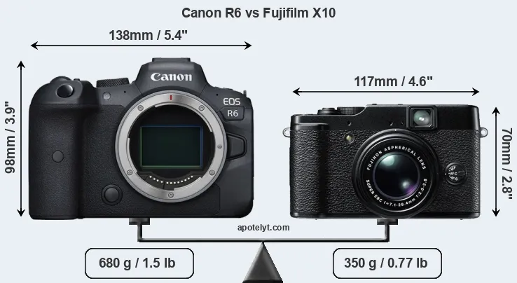 If the front view area (width x height) of the cameras is taken as an aggregate measure of their size, the Fujifilm X10 is considerably smaller (39 percent) than the Canon R6. It is worth mentioning in this context that the R6 is splash and dust resistant, while the X10 does not feature any corresponding weather-sealing.