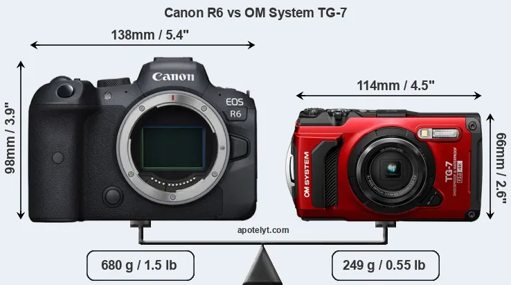 The above size and weight comparisons are to some extent incomplete and possibly misleading, as the TG-7 has a lens built in, whereas the R6 is an interchangeable lens camera that requires a separate lens. Attaching the latter will add extra weight and bulk to the setup.