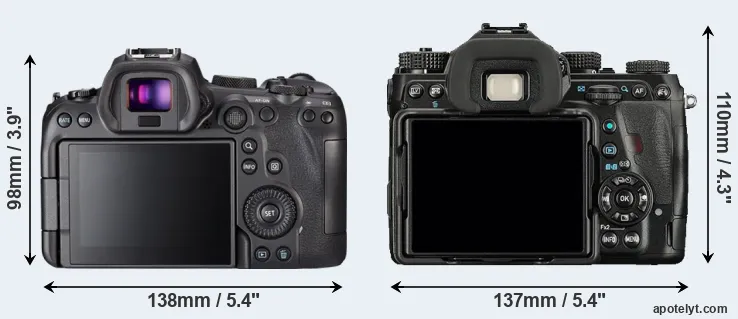 The physical size and weight of the Canon R6 and the Pentax K-1 are illustrated in the side-by-side display below. The two cameras are presented according to their relative size. Three consecutive perspectives from the front, the top, and the back are available. All width, height and depth dimensions are rounded to the nearest millimeter.