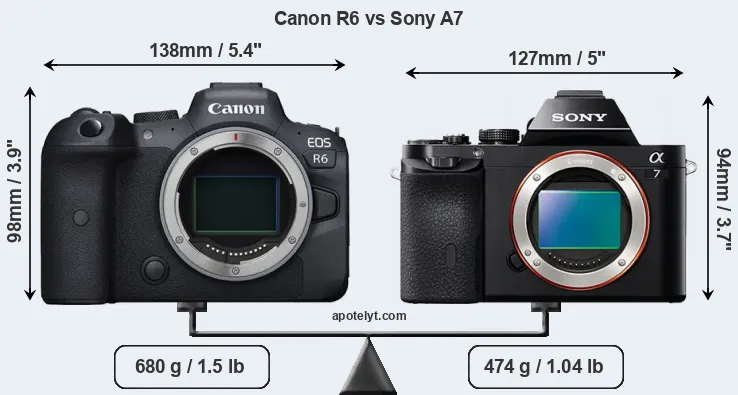 The side-by-side display below illustrates the physical size and weight of the Canon R6 and the Sony A7. The two cameras are presented according to their relative size. Three successive views from the front, the top, and the rear are shown. All width, height and depth dimensions are rounded to the nearest millimeter.