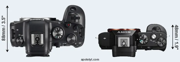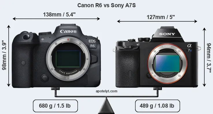 The physical size and weight of the Canon R6 and the Sony A7S are illustrated in the side-by-side display below. The two cameras are presented according to their relative size. Three consecutive perspectives from the front, the top, and the back are available. All width, height and depth dimensions are rounded to the nearest millimeter.