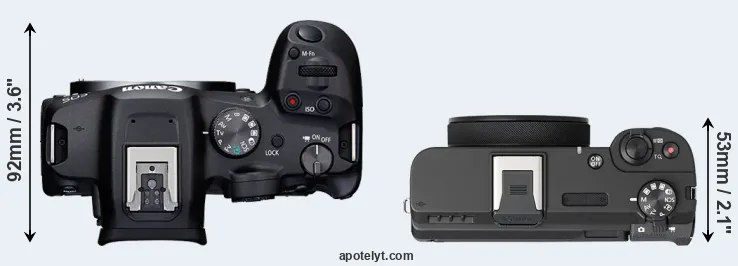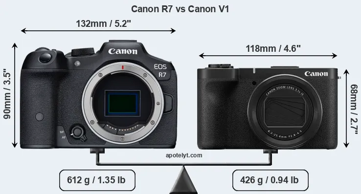The side-by-side display below illustrates the physical size and weight of the Canon R7 and the Canon V1. The two cameras are presented according to their relative size. Three consecutive perspectives from the front, the top, and the back are available. All width, height and depth measures are rounded to the nearest millimeter.