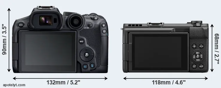The above size and weight comparisons are to some extent incomplete and possibly misleading, as the V1 has a lens built in, whereas the R7 is an interchangeable lens camera that requires a separate lens. Attaching the latter will add extra weight and bulk to the setup.