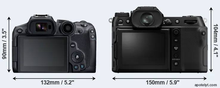 The side-by-side display below illustrates the physical size and weight of the Canon R7 and the Fujifilm GFX 100S II. The two cameras are presented according to their relative size. Three successive views from the front, the top, and the rear are shown. All width, height and depth measures are rounded to the nearest millimeter.