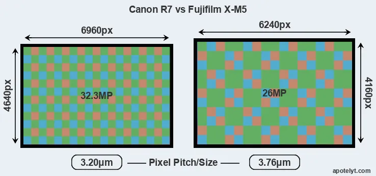 | Sensor Specs | Canon R7 | Fujifilm X-M5 |