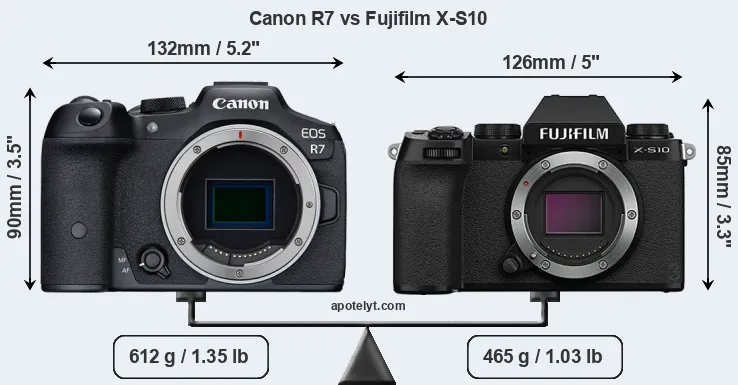 An illustration of the physical size and weight of the Canon R7 and the Fujifilm X-S10 is provided in the side-by-side display below. The two cameras are presented according to their relative size. Three consecutive views from the front, the top, and the rear side are shown. All width, height and depth dimensions are rounded to the nearest millimeter.