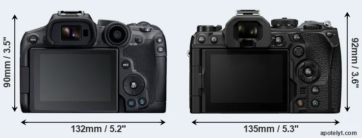 The side-by-side display below illustrates the physical size and weight of the Canon R7 and the OM System OM-1 II. The two cameras are presented according to their relative size. Three successive views from the front, the top, and the rear are shown. All width, height and depth measures are rounded to the nearest millimeter.