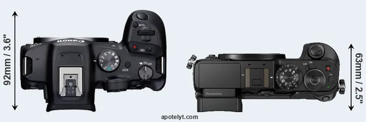 The side-by-side display below illustrates the physical size and weight of the Canon R7 and the Panasonic GX8. The two cameras are presented according to their relative size. Three consecutive perspectives from the front, the top, and the back are available. All width, height and depth dimensions are rounded to the nearest millimeter.