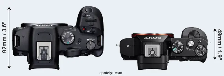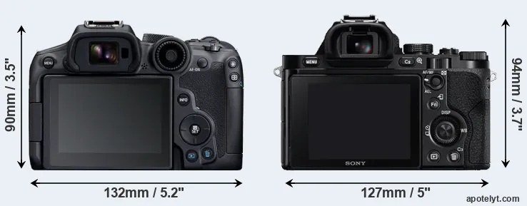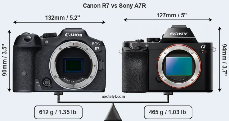 An illustration of the physical size and weight of the Canon R7 and the Sony A7R is provided in the side-by-side display below. The two cameras are presented according to their relative size. Three successive views from the front, the top, and the rear are shown. All size dimensions are rounded to the nearest millimeter.