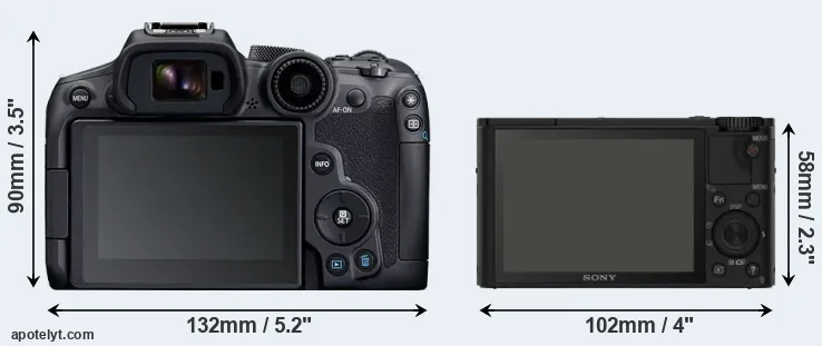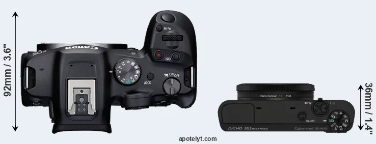 The side-by-side display below illustrates the physical size and weight of the Canon R7 and the Sony RX100. The two cameras are presented according to their relative size. Three consecutive views from the front, the top, and the rear side are shown. All width, height and depth dimensions are rounded to the nearest millimeter.