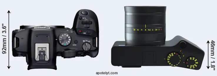 The physical size and weight of the Canon R7 and the Zeiss ZX1 are illustrated in the side-by-side display below. The two cameras are presented according to their relative size. Three successive views from the front, the top, and the rear are shown. All size dimensions are rounded to the nearest millimeter.