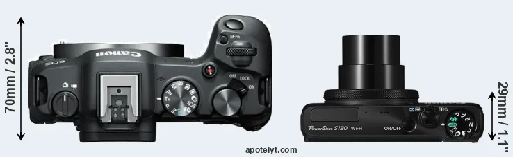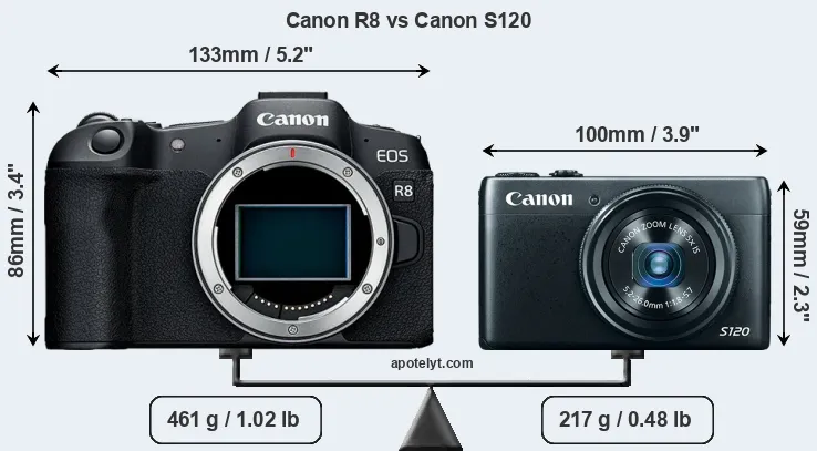 The physical size and weight of the Canon R8 and the Canon S120 are illustrated in the side-by-side display below. The two cameras are presented according to their relative size. Three successive views from the front, the top, and the rear are shown. All width, height and depth measures are rounded to the nearest millimeter.