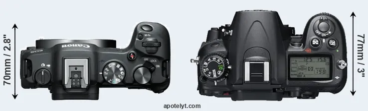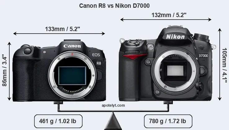 An illustration of the physical size and weight of the Canon R8 and the Nikon D7000 is provided in the side-by-side display below. The two cameras are presented according to their relative size. Three consecutive perspectives from the front, the top, and the back are available. All width, height and depth measures are rounded to the nearest millimeter.