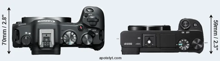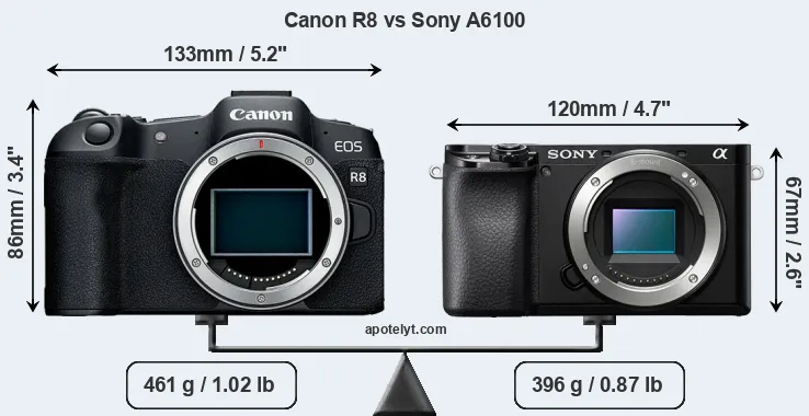 The side-by-side display below illustrates the physical size and weight of the Canon R8 and the Sony A6100. The two cameras are presented according to their relative size. Three successive views from the front, the top, and the rear are shown. All size dimensions are rounded to the nearest millimeter.