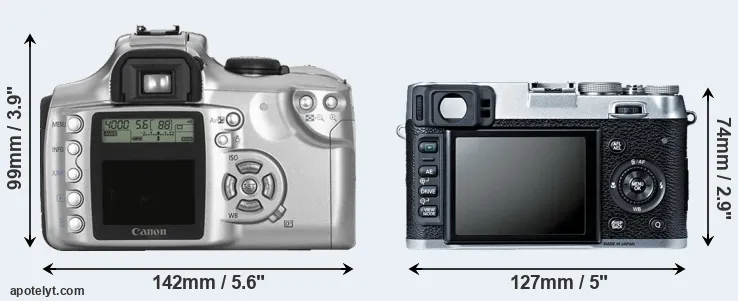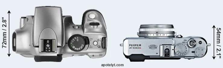 The side-by-side display below illustrates the physical size and weight of the Canon Rebel and the Fujifilm X100S. The two cameras are presented according to their relative size. Three consecutive perspectives from the front, the top, and the back are available. All width, height and depth dimensions are rounded to the nearest millimeter.