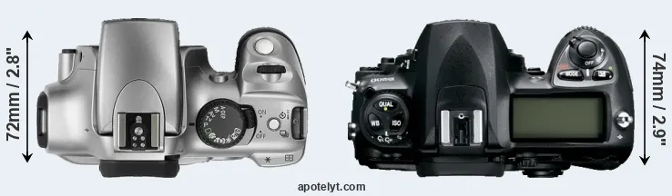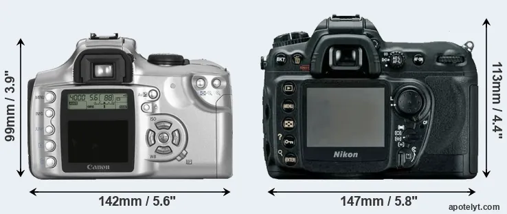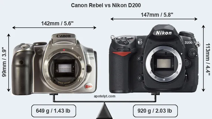 The side-by-side display below illustrates the physical size and weight of the Canon Rebel and the Nikon D200. The two cameras are presented according to their relative size. Three consecutive perspectives from the front, the top, and the back are available. All width, height and depth measures are rounded to the nearest millimeter.
