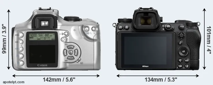The Canon EOS Digital Rebel (called Canon 300D in some regions) and the Nikon Z7 II are two digital cameras that were announced, respectively, in August 2003 and October 2020. The Rebel is a DSLR, while the Z7 II is a mirrorless interchangeable lens camera. The cameras are based on an APS-C (Rebel) and a full frame (Z7 II) sensor. The Canon has a resolution of 6.3 megapixels, whereas the Nikon provides 45.4 MP.