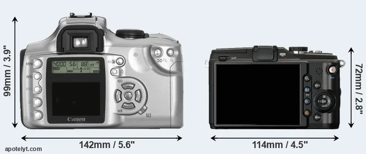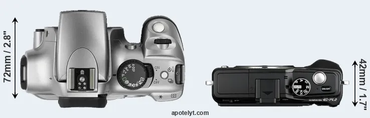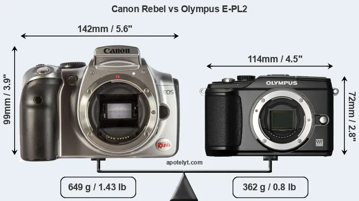 The side-by-side display below illustrates the physical size and weight of the Canon Rebel and the Olympus E-PL2. The two cameras are presented according to their relative size. Three successive views from the front, the top, and the rear are shown. All width, height and depth measures are rounded to the nearest millimeter.