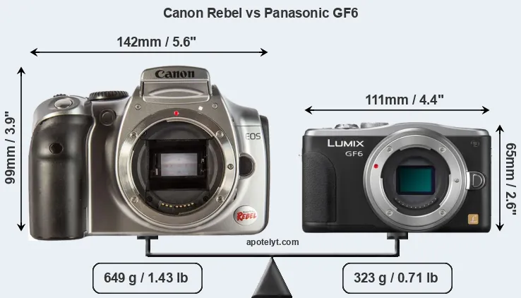 If the front view area (width x height) of the cameras is taken as an aggregate measure of their size, the Panasonic GF6 is considerably smaller (49 percent) than the Canon Rebel. Moreover, the GF6 is substantially lighter (50 percent) than the Rebel. In this context, it is worth noting that neither the Rebel nor the GF6 are weather-sealed.