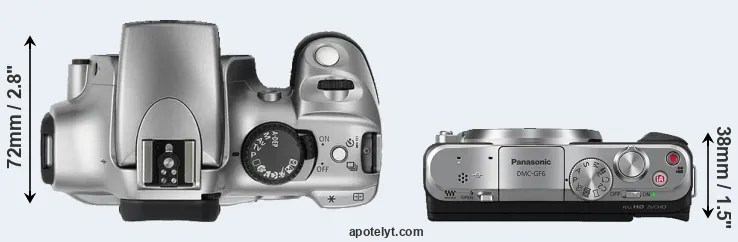 The side-by-side display below illustrates the physical size and weight of the Canon Rebel and the Panasonic GF6. The two cameras are presented according to their relative size. Three successive views from the front, the top, and the rear are shown. All size dimensions are rounded to the nearest millimeter.