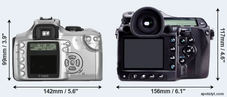 Going beyond this snapshot of core features and characteristics, what are the differences between the Canon EOS Digital Rebel and the Pentax 645D? Which one should you buy? Read on to find out how these two cameras compare with respect to their body size, their imaging sensors, their shooting features, their input-output connections, and their reception by expert reviewers.